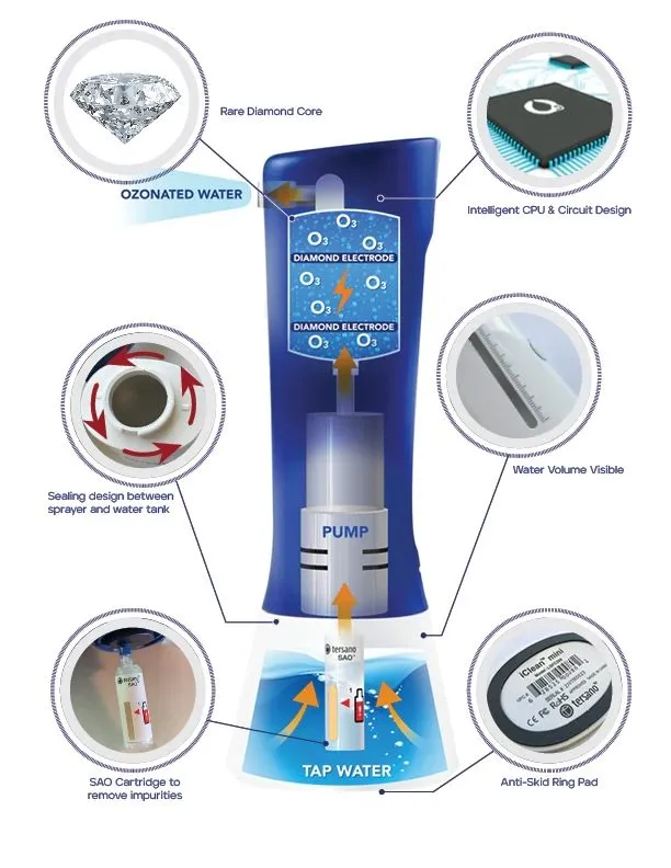 iClean mini ประกอบด้วยกลไกขั้วไฟฟ้าและไดมอนด์ ที่ส่งกระแสไฟฟ้าผ่านออกซิเจนในอากาศ เปลี่ยนออกซิเจน (O2) เป็นโอโซน (O3) จากนั้นจะถูกอัดลงในน้ำประปา สร้างน้ำโอโซนได้ทันที ซึ่งเป็นน้ำยาทำความสะอาดและน้ำยาฆ่าเชื้อจากธรรมชาติที่ปลอดภัย แต่ทรงพลังยิ่ง