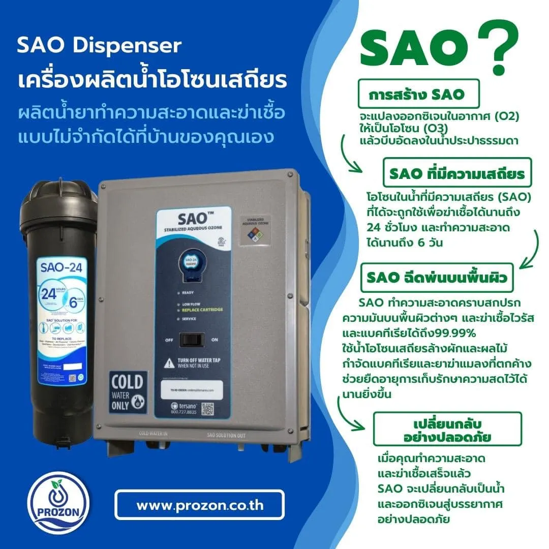 SAO Dispenser นวัตกรรมจาก Tersano ผลิตน้ำโอโซนเสถียร มีประสิทธิภาพในการทำความสะอาด กำจัดกลิ่นที่ไม่พึงประสงค์ และยังสามารถฆ่าเชื้อไวรัสและแบคทีเรีย ได้สูงถึง 99.99% น้ำโอโซนเสถียรช่วยทำความสะอาดภายในบ้านและห้องครัวให้คุณหมดกังวลเรื่องสารเคมีที่อาจจะปนเปื้อนในอาหาร และไม่มีสารเคมีตกค้างภายในห้องครัว ใช้น้ำโอโซนเสถียรล้างผักและผลไม้ ช่วยกำจัดแบคทีเรีย และยาฆ่าแมลงที่ตกค้าง จะช่วยยืดอายุการเก็บรักษาความสดไว้ได้นานยิ่งขึ้น