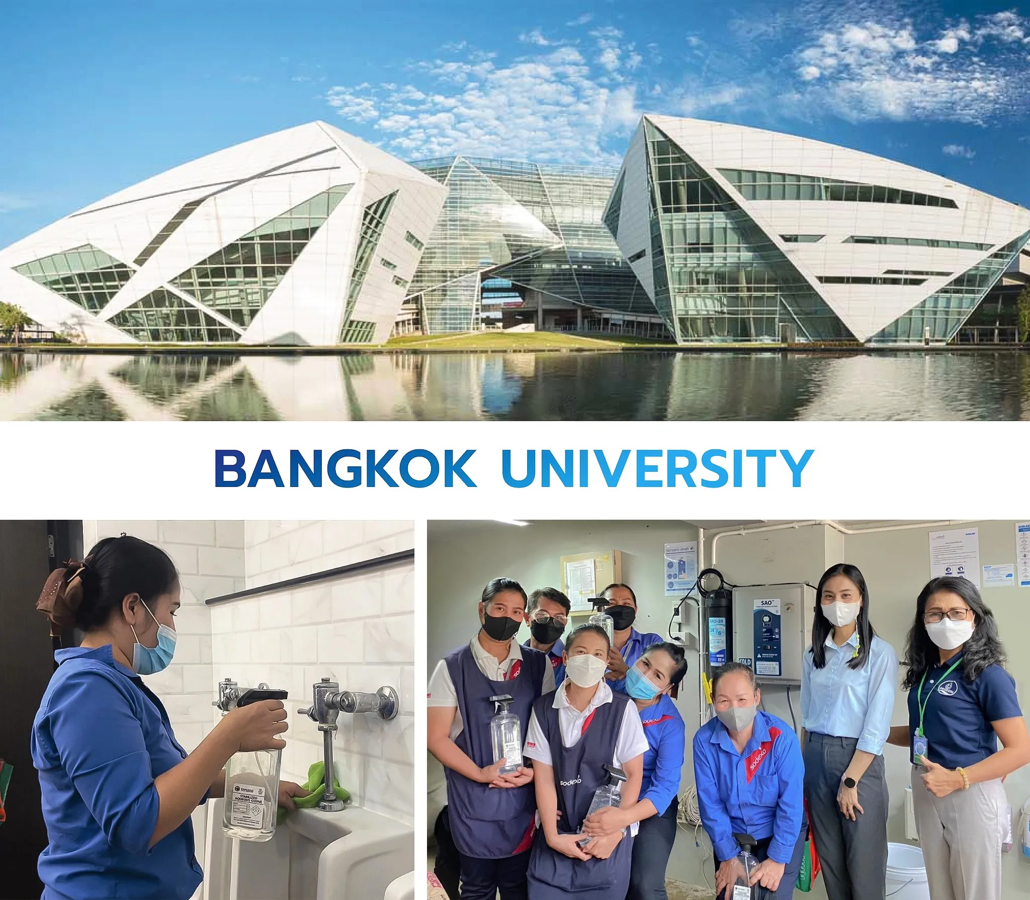 อย่าง Bangkok University เลือกเปลี่ยนวิธีทำความสะอาด จากสารเคมีทําความสะอาดแบบดั้งเดิมเป็น Stabilized Aqueous Ozone (SAO)วิธีการทำความสะอาด และฆ่าเชื้อที่ยั่งยืนมากขึ้นปราศจากสารเคมีที่เป็นพิษและลดขยะพลาสติก
