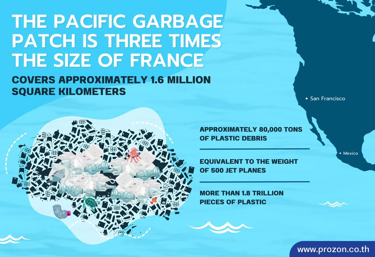 Great Pacific Garbage Patch เกาะขยะที่มีขนาดใหญ่กว่าประเทศฝรั่งเศสถึง 3 เท่า มวลขยะพลาสติกจากมนุษย์ ที่ไหลมารวมกันเป็นขนาดมหึมาลอยอยู่ใจกลางมหาสมุทรแปซิฟิก พลาสติกบางส่วนมีอายุมากกว่า 50 ปี และตามรายงานของ Ocean Conservancy พลาสติกที่ลอยอยู่บนพื้นผิวทะเลมีเพียงประมาณ 5% และอีก 95% อยู่ใต้ผิวน้ํา น่าเศร้าที่สิ่งนี้ได้กลายเป็นระบบนิเวศใหม่ของสัตว์หลายชนิดในทะเล ที่มาอาศัยอยู่ในแพขยะนี้