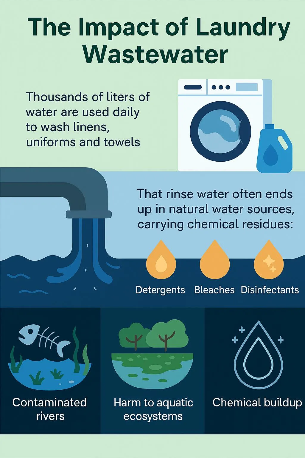 ทุกๆ วัน มีการใช้น้ำหลายพันลิตรในการซักผ้าปูที่นอน ชุดยูนิฟอร์ม ผ้าขนหนู และเครื่องนอนในโรงแรม สถานพยาบาล หรือสถานที่อื่นๆ แต่ไม่ใช่แค่เพียงน้ำเท่านั้นที่ไหลลงท่อระบายน้ำ น้ำที่ผ่านกระบวนการซักมีสารเคมีที่เป็นผงซักฟอก สารฟอกขาว น้ำยาปรับผ้านุ่ม และน้ำยาฆ่าเชื้อ และมักจะลงเอยในแหล่งน้ำธรรมชาติโดยแทบไม่มีการบำบัดเลย