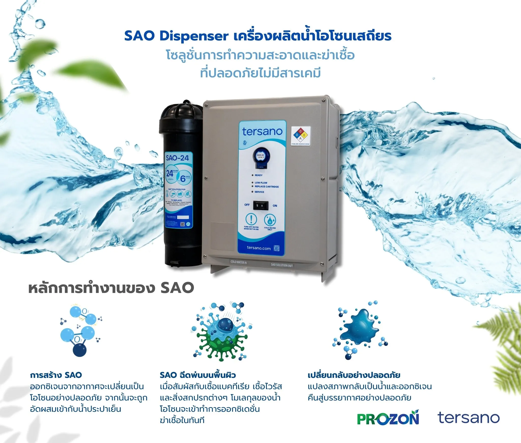 SAO Dispenser จาก Tersano นวัตกรรมที่เปลี่ยนน้ำธรรมดาให้กลายเป็น น้ำโอโซนเสถียร พลังทำความสะอาดสูง ช่วยขจัดคราบ กำจัดกลิ่นไม่พึงประสงค์ และฆ่าเชื้อไวรัสและแบคทีเรียได้สูงถึง 99.99%